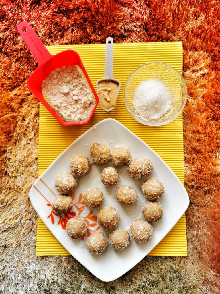 Mezclar la mantequilla de maní con la harina de avena, amasar hasta que todo se vaya impregnando, luego hacer bolitas. Una vez listas pasar por Coco rallado y servir.